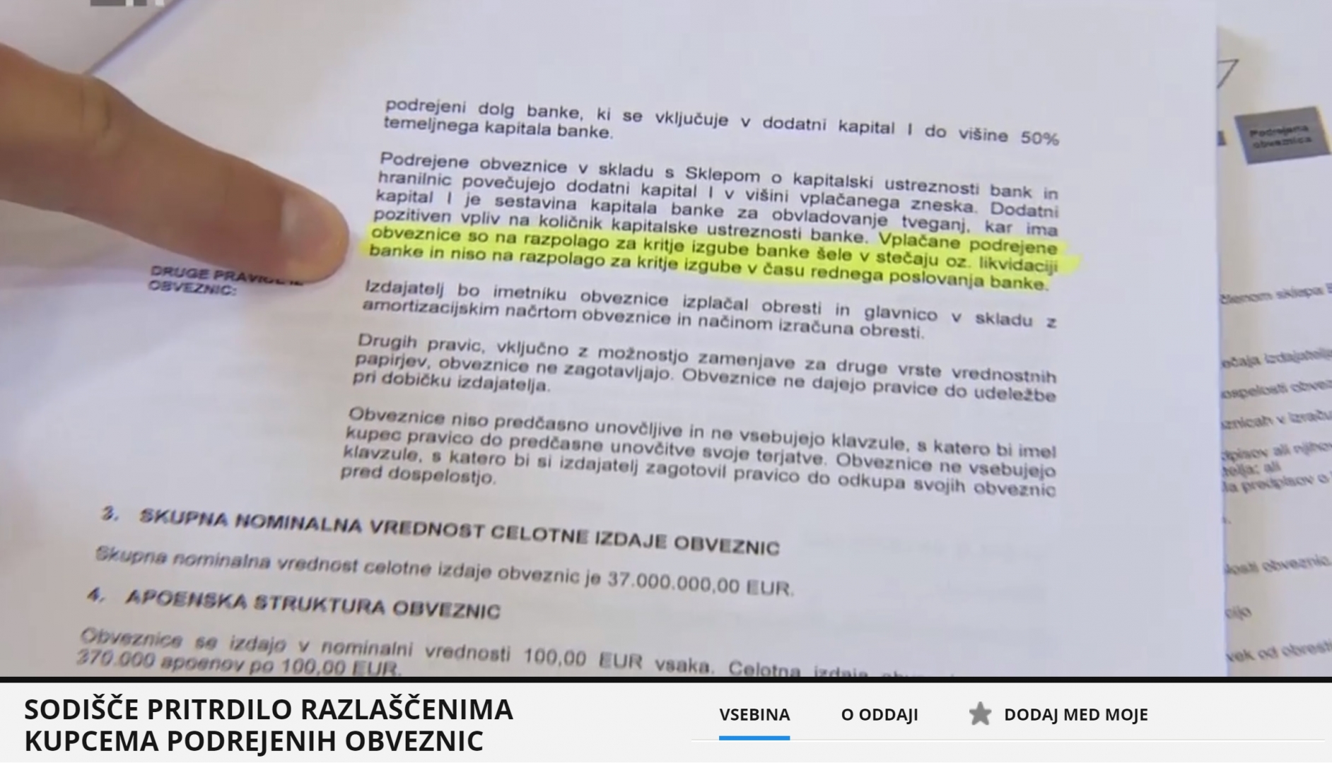 MARKO ŠTOR (novinar): Kupca podrejenih obveznic, sicer odvetniški par iz Celja sta v 12. izdajo obveznic Banke Celje vložila vsak po 580.000 evrov. Kot je razvidno iz sodbe sta Banki Celje očitala, da ju ob tem ni poučila o vseh tveganjih povezanih s podrejenimi obveznicami, hkrati pa nista bila seznanjena s samim prospektom, ki je ob prvi prodaji obveznic nujen dokument.